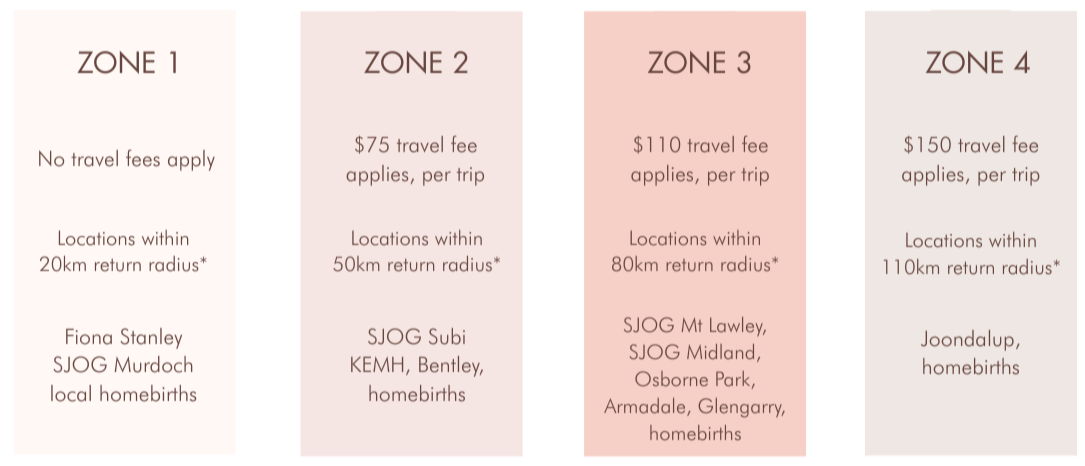 You birth at SJOG Subiaco (Zone 2 - travel fee of $75 per trip) and choose Option 3 ($475) = Total - $625
